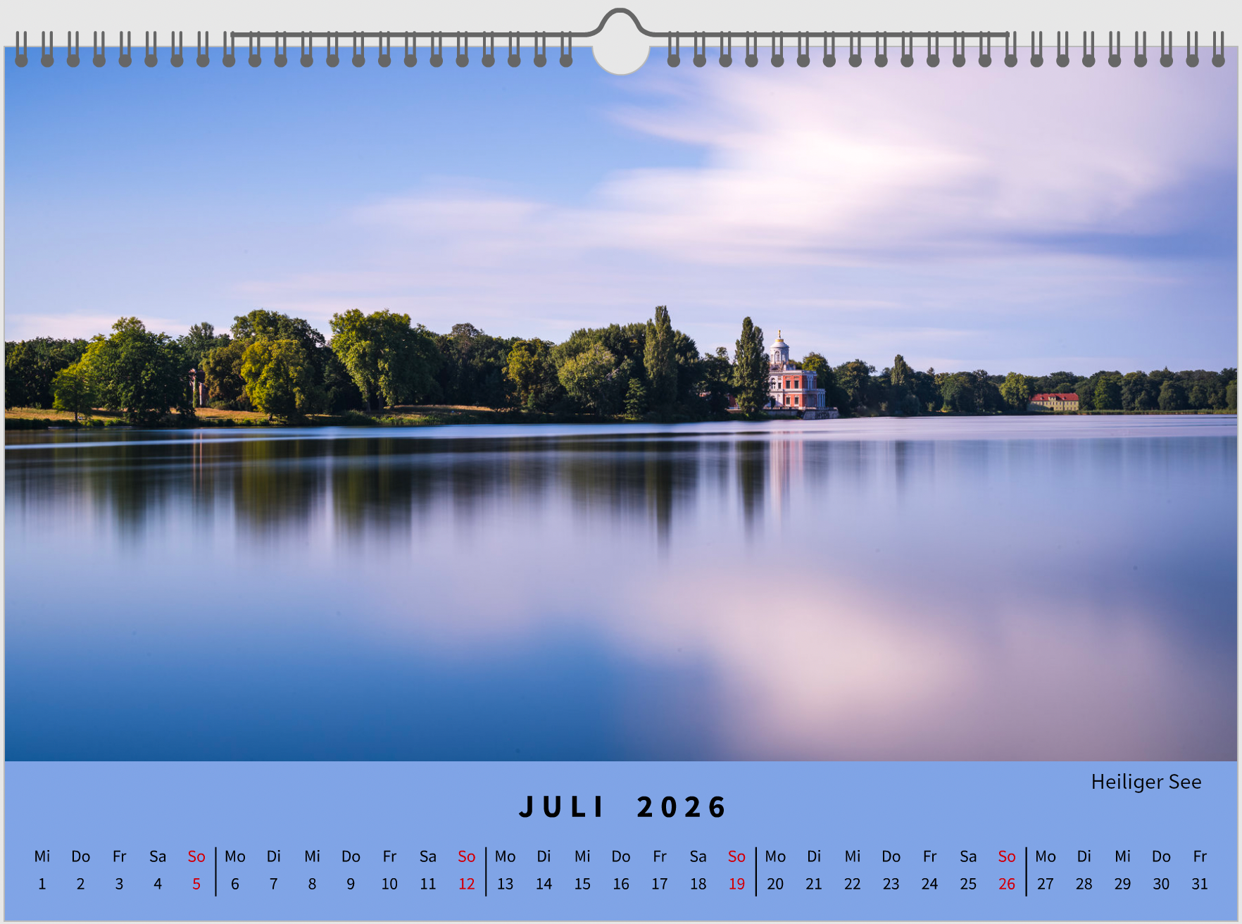 Der Wandkalender hat die Maße 45cm in der Breite und 30cm in der Höhe. Er wird auf FUJIFILM Crystal Archive DP II Silk Papier (Grammatur: 232 g/m², FSC®-zertifiziert) gedruckt, was durch seine feine Wabenstruktur eine einzigartige Oberfläche, Textur und Farbwiedergabe bietet. Er verfügt über eine klassische Drahtkammbindung mit einem robusten Aufhänger, der in dieser Bindung eingeschlossen wird und kann so einfach an die Wand gehängt werden.